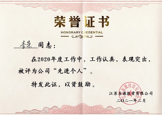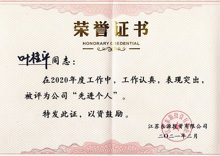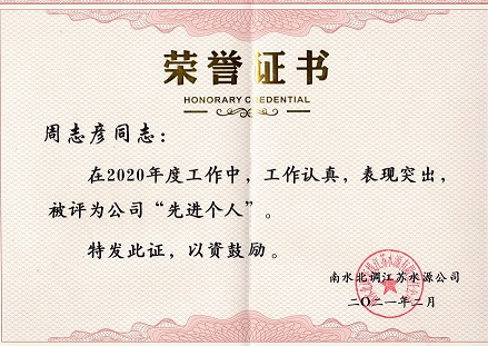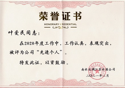 近日,我公司葉愛民、周志彥兩位同志榮獲南水北調江蘇水源公司“2020年度水源紅·感動水源”先進個人;李榮、葉桂平榮獲江蘇東源投資有限公司先進個人。