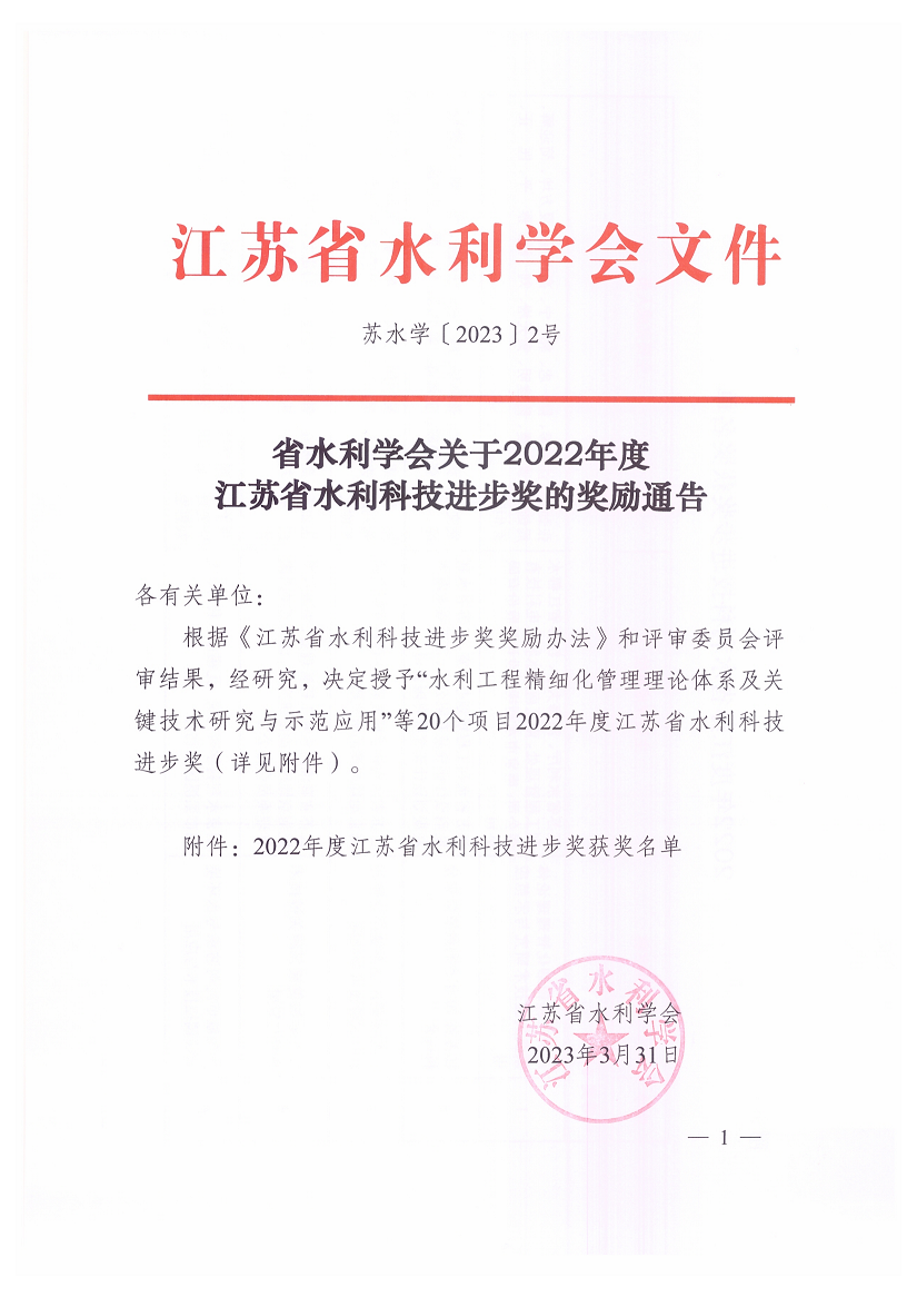 近日,省水利學會發布了“2022年度江蘇省水利科技進步獎”獎勵通告,公司作為承擔單位的“江蘇治淮重要堤防防滲隱患診斷與處理及評價研究”項目榮獲三等獎。公司將繼續以技術研發創新為牽引,踐行企業高質量發展理念,銳意進取、勇攀高峰,不斷夯實企業發展基礎。